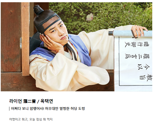 어사 라이언 역을 맡은 옥택연 배우는 다들 아시다시피 2pm의 멤버이자 얼마 전 끝난 빈센조 영화에서 악역의 모습으로 변신을 꾀한 배우입니다. 옥택연 배우의 악역 연기가 매우 새로웠기에 이번 역할인 어사의 역에도 얼마나 잘 어울릴지 기대가 됩니다. 평소에도 옥택연 배우가 요리를 좋아하는 것으로 알고 있었는데 이번 역할에도 출세는 귀찮으나 요리를 좋아하는 역으로 맛집을 찾아다닙니다.