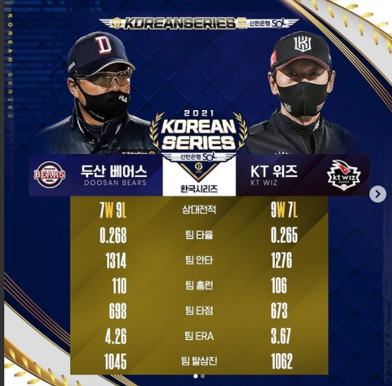 두산과 KT의 올해 상대 전적은 총 16경기 중 KT가 9승 ,두산이 7승을 했습니다. 하지만 팀 타율 및 팀 방어율에서는 두산이 우위를 점하고 있다고 합니다. 득점 또한 두산이 71 득점, KT가 62 득점이라고 하네요. 그동안 두 팀의 경기는 큰 점수차로 이기고 지는 경기는 별로 없었고 박빙의 승부가 많았다고 하니 이번 한국시리즈도 박빙의 승부가 있으리라 생각됩니다.
