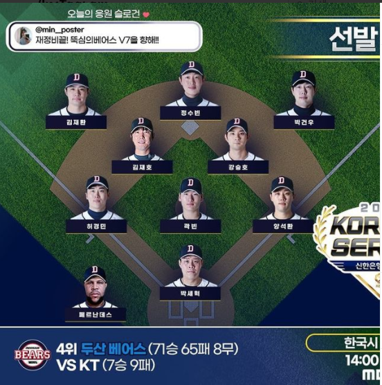 드디어 21.11.14일 일요일 , 오늘 한국시리즈가 시작합니다. 4위였던 두산이 와일드카드(vs키움), 준플레이오프(vs LG), 플레이오프(vs 삼성)에서 모든 팀을 이기고 드디어 키움과 한국시리즈를 경기합니다.