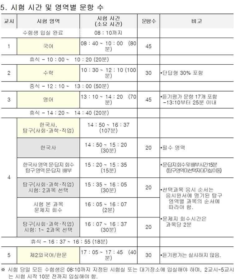 수능 시간표는 위의 표와 같습니다.